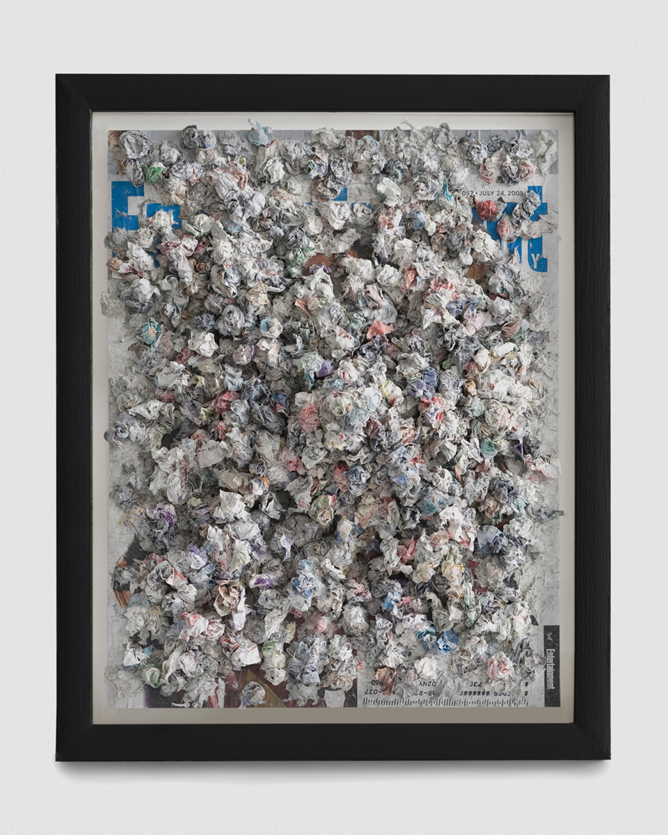 All the paper from one Entertainment magazine spat back at the cover, mounted to sintra, the magazine is dated from the first week I began collecting unemployment benefits in 2009 after being laid of from my job.
